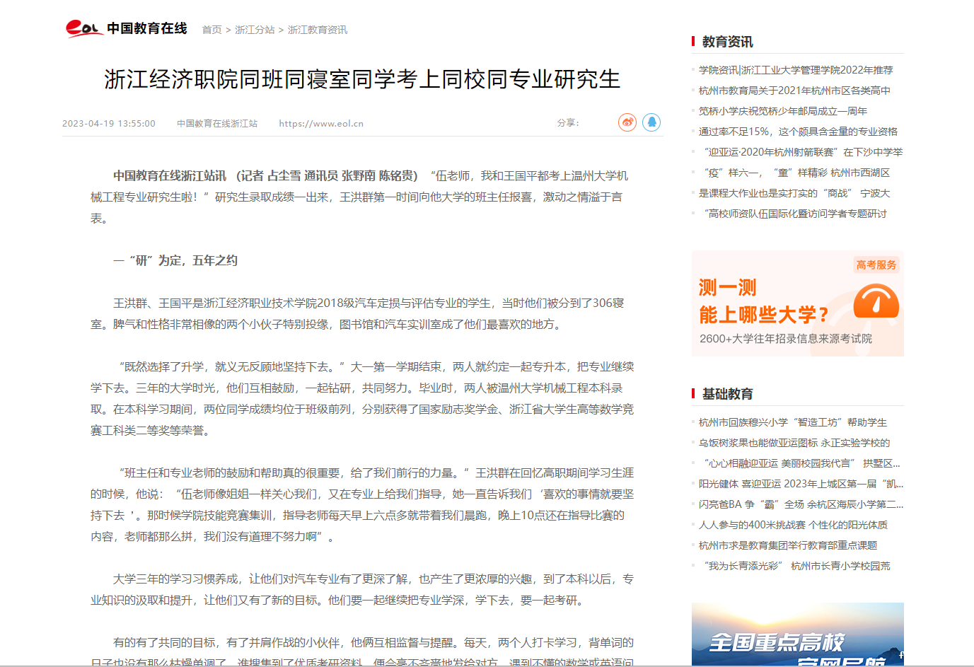 【中国教育在线】浙江经济职院同班同寝室同学考上同校同专业研究生