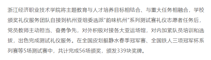 近日,教育厅公众号“教育之江”刊发我校落实主题教育“学思想、强党性、重实践、建新功”总要求,结合学校实际,将主题教育和服务保障亚运工作紧密融合,高质量开展主题教育,高质量服务杭州亚运,有力彰显护航亚运的高校担当。