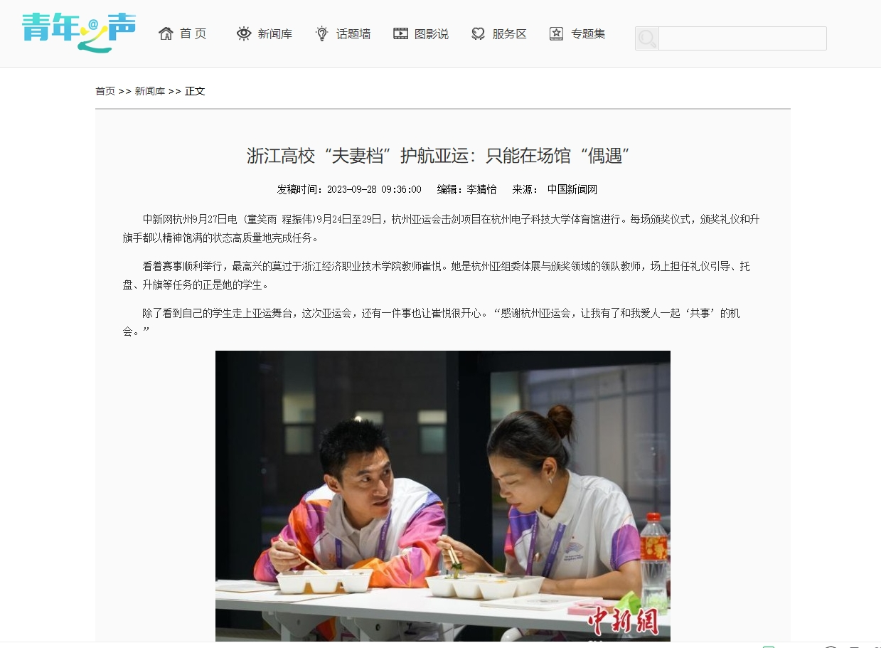 近日,《中国青年网》报道在亚运期间,我校教师崔悦是杭州亚组委体展与颁奖领域的领队教师,除了看到自己的学生走上亚运舞台,也她开心的还有就是有了和她爱人一起共事的机会,趁着晚餐时间,两人“久违”地碰了面。