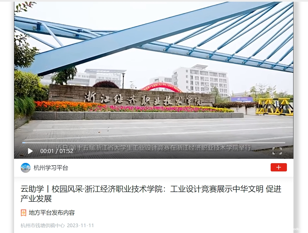 近日,《学习强国》刊发展示我校承办的第十五届浙江省大学生工业设计竞赛实况。