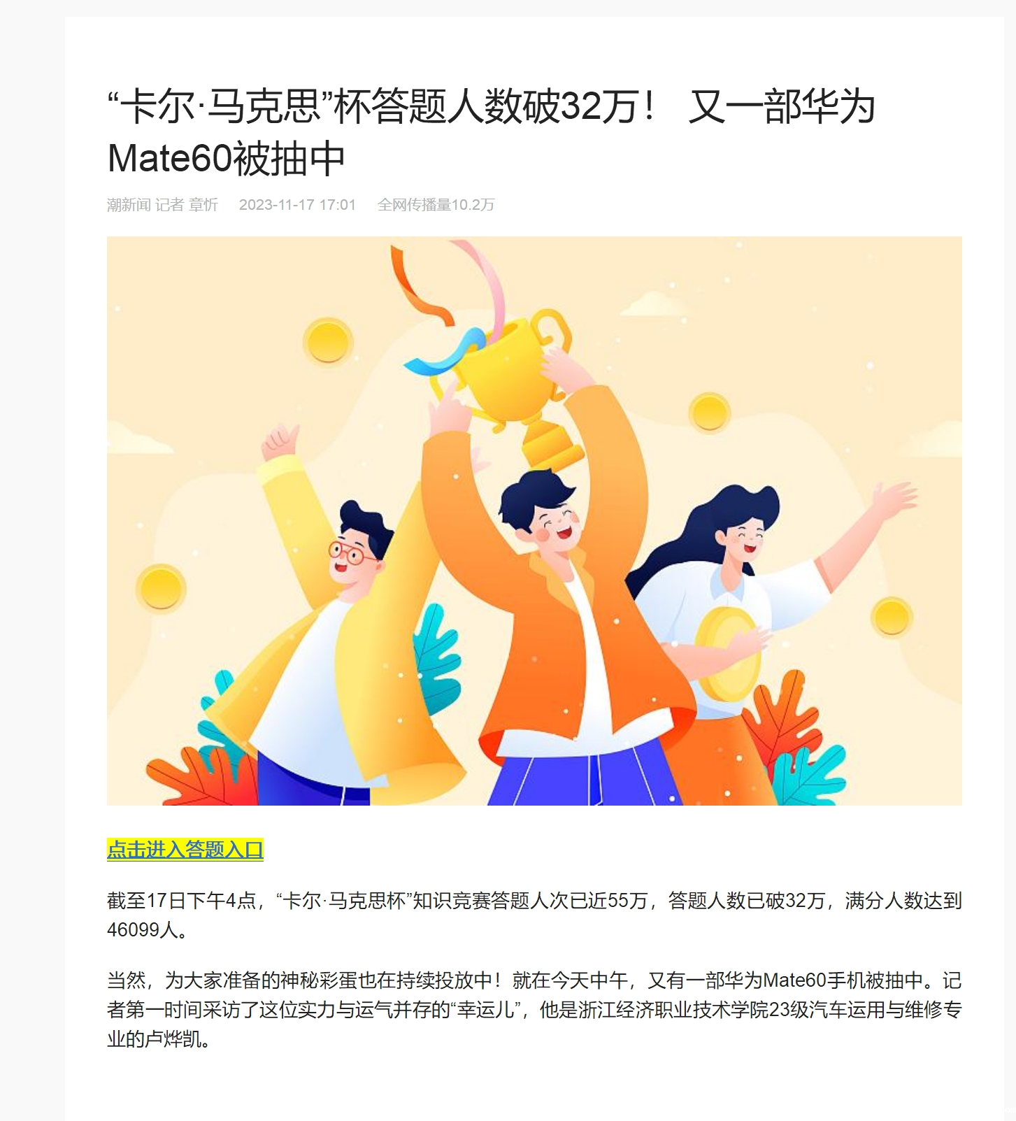【潮新闻】“卡尔·马克思”杯答题人数破32万! 又一部华为Mate60被抽中
