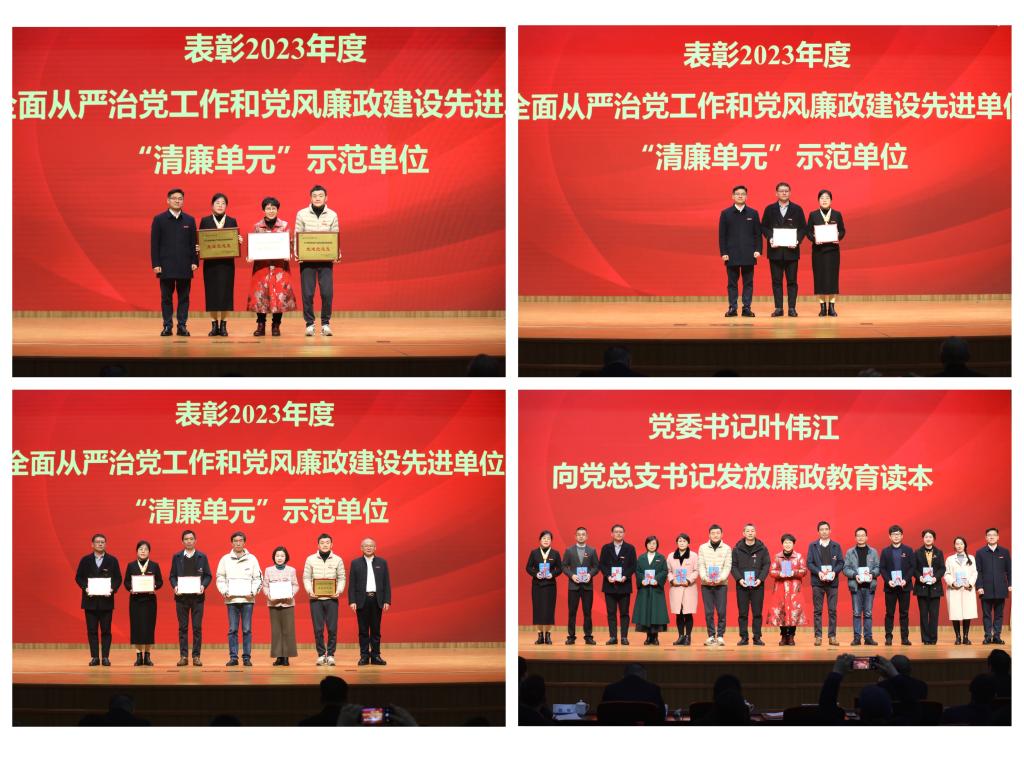 会议还表彰了2023年度全面从严治党主体责任落实情况先进党总支、党风廉政建设先进党总支,以及清廉学院、清廉党支部、清廉部门等先进集体,并向各党总支发放了警示教育读本。