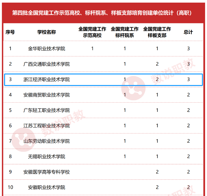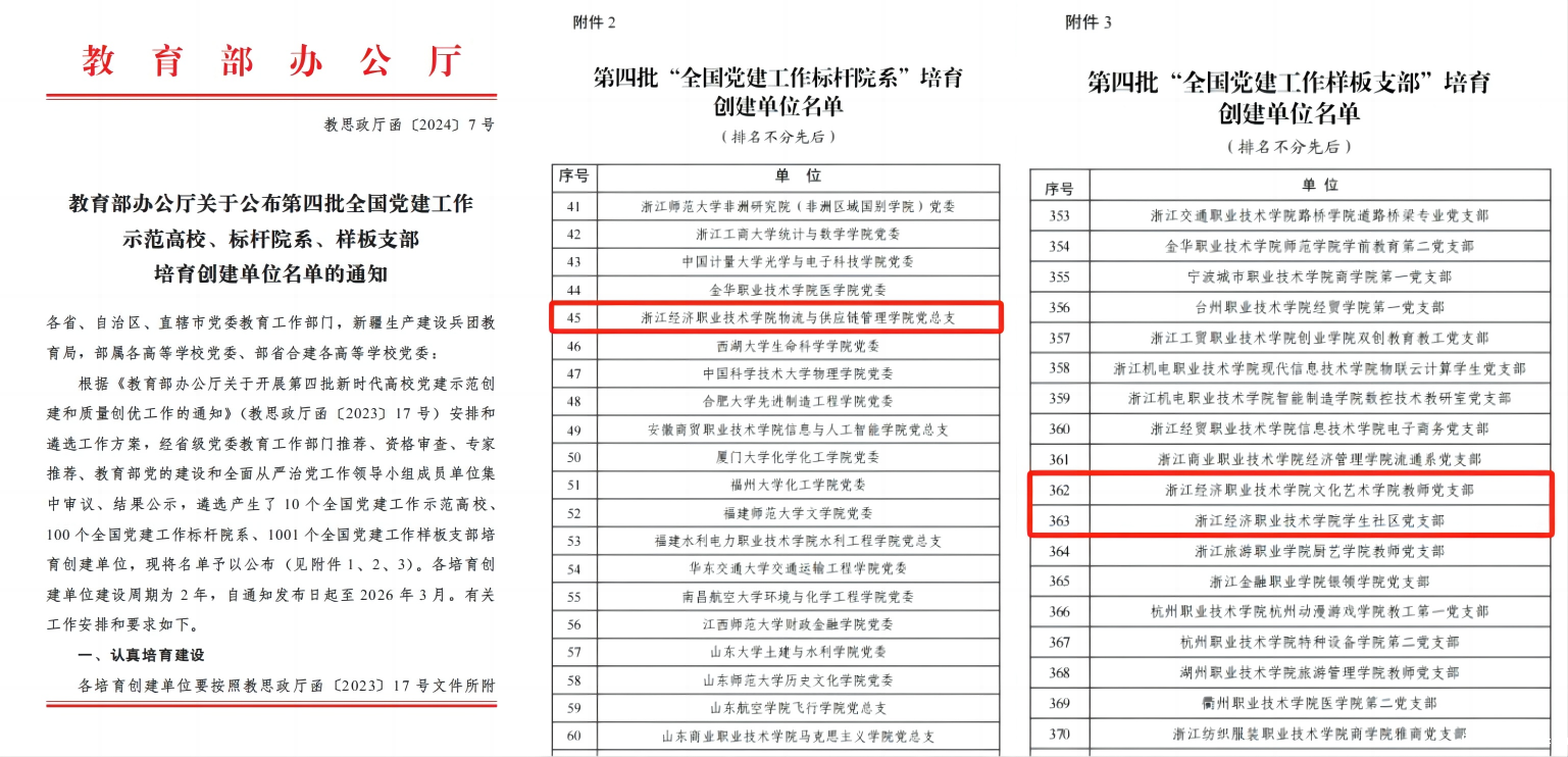 近日,教育部公布了第四批全国党建工作示范高校、标杆院系、样板支部培育创建单位名单。其中我校物流与供应链管理学院党总支入选“全国党建工作标杆院系”培育创建单位,自2019年教育部启动新时代高校党建示范创建和质量创优工作以来,截至目前,全省高职高专院校仅有4所获此殊荣。同时,我校文化艺术学院教师党支部、学生社区党支部入选“全国党建工作样板支部”培育创建单位。据数说职教统计,我校在第四批全国党建双创项目数列全国高职高专院校中排名并列第二。