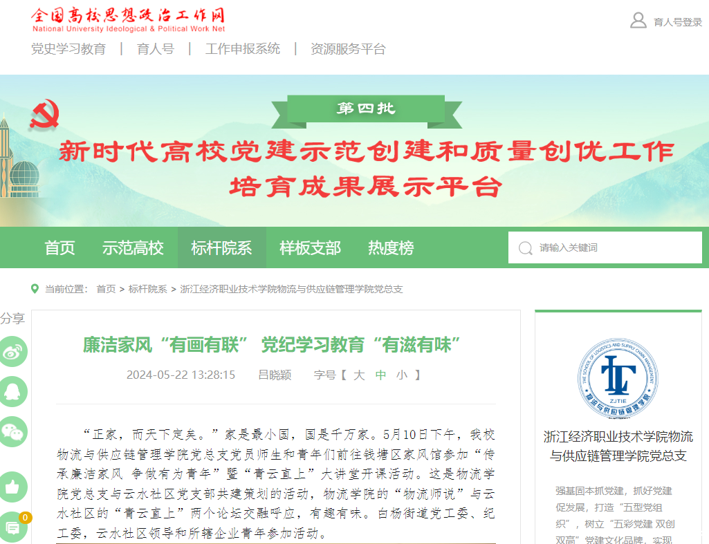 5月10日下午,学校物流与供应链管理学院党总支党员师生和青年们前往钱塘区家风馆参加“传承廉洁家风 争做有为青年”暨“青云直上”大讲堂开课活动。活动受全国高校思想政治工作网报道。