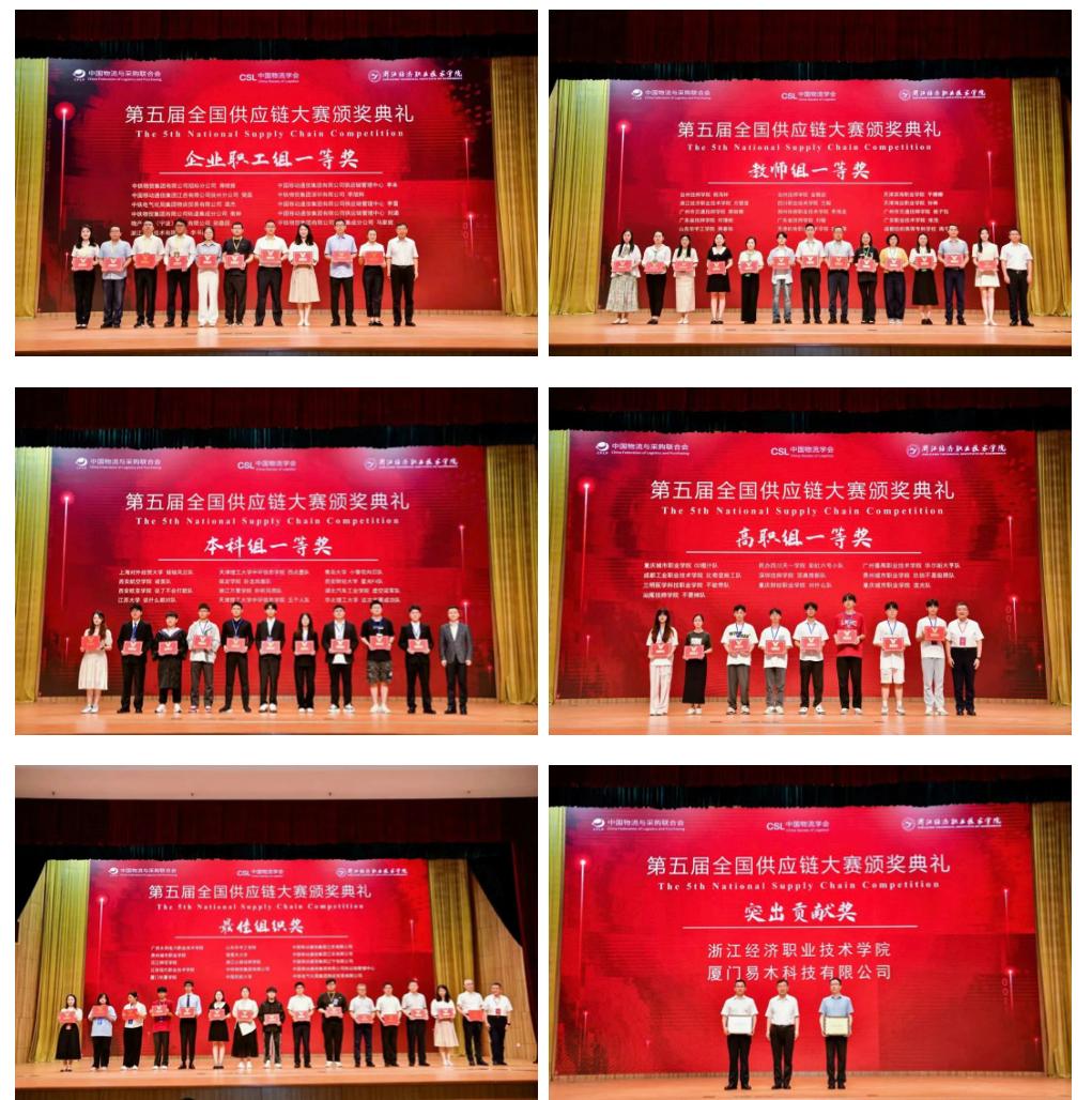 2024年6月20至23日,第五届全国供应链大赛决赛在浙江杭州举行。本届大赛由中国物流与采购联合会与中国物流学会主办,厦门易木科技有限公司提供技术支持,决赛由华体汇app全站版承办。经过两天激烈的角逐,第五届全国供应链大赛颁奖典礼于23日上午隆重举行。中国物流与采购联合会副会长、中国物流学会会长、物流行指委主任任豪祥,华体汇app全站版党委书记叶伟江,中国物流学会副会长兼秘书长、中国物流与采购联合会副秘书长、物流行指委秘书长郭肇明,华体汇app全站版党委副书记、校长柯孔林,华体汇app全站版党委委员、副校长聂华,浙江省机电集团教育事业部部长张加涨,大赛专家组组长、物流教指委“全国民办高校物流与供应链管理类专业创新发展联盟”主任委员、厦门华厦学院常务副校长陈民伟,大赛专家组组长、浙江工商大学现代物流与供应链研究中心主任傅培华,浙江省物流协会秘书长孙金丹,中国计量大学教务处副处长赵春鱼,中国物流与采购联合会教育培训中心主任、物流行指委副秘书长李俊峰等领导出席颁奖典礼并为获奖队伍颁奖。