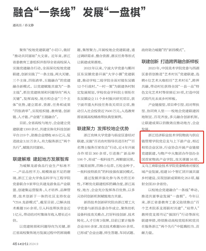 近日,浙江省党建指导性刊物《共产党员》刊发我校物流与供应链管理学院联建创新,打造跨界融合新样板。学院党总支与上下游产业、相近 相邻企业区块、行业协会开展产业链接 党建联建,与物产中大集团合作创办全 国首家物流产业学院,攻关课题16项。