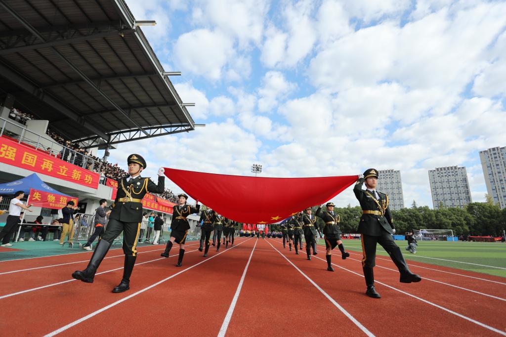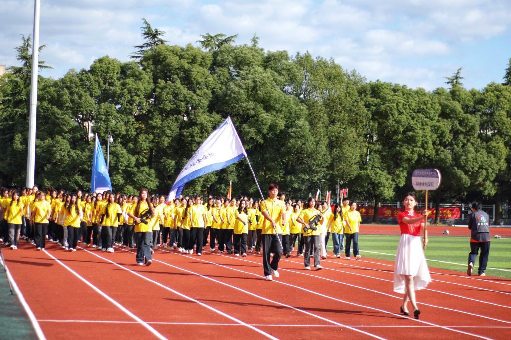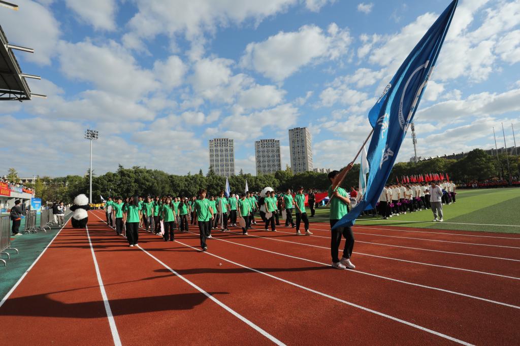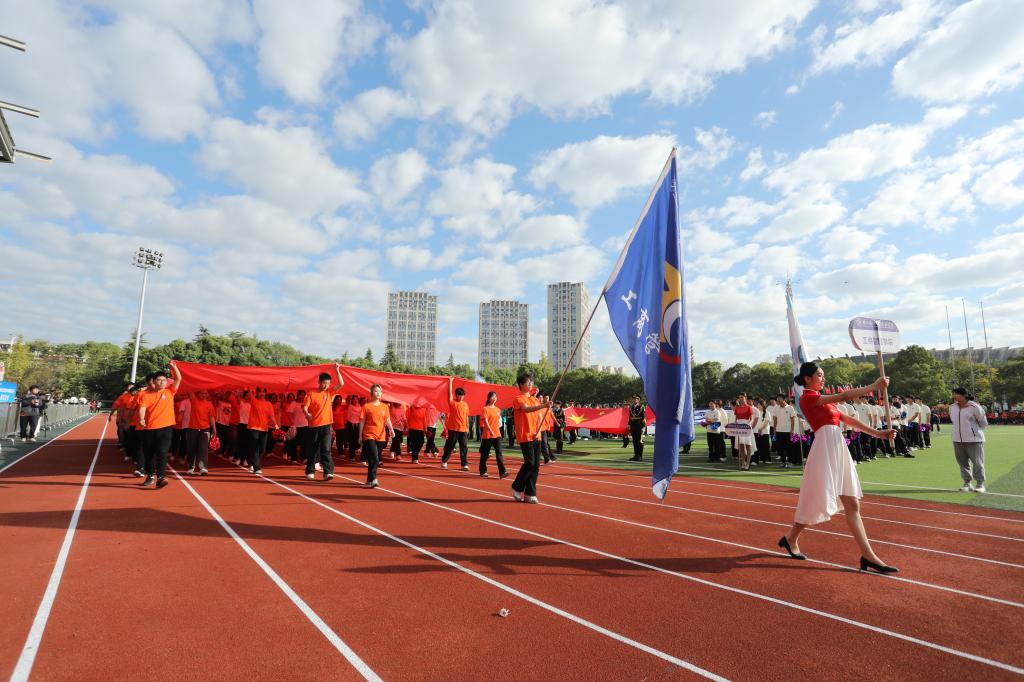 伴随着雄壮的《运动员进行曲》,国旗队、校旗队、会徽与鲜花队、彩旗队和各二级学院方队依次入场。