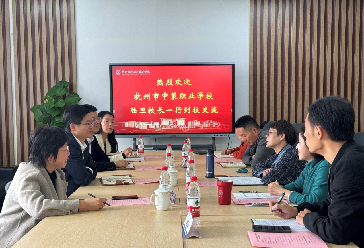 11月18日下午,杭州市中策职业学校校长陆旦携副校长潘莉荷、金涛以及现代商务部副部长戴一佳一行来我院交流。学校党委委员、副校长陈专,财会金融学院院长王茜,副院长崔玉江,党总支副书记康粟丰及大数据与会计专业主管殷慧敏等参加本次交流活动。