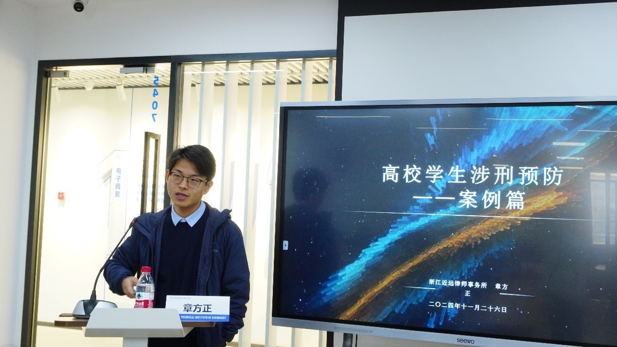 为深入学习宣传贯彻党的二十届三中全会精神,大力加强宪法学习宣传,强化宪法意识,弘扬宪法精神,11月26日下午,商贸流通学院于系统科技楼5407开展“法润校园,宪在行动”——2024年宪法宣传周暨《阿飞普法》200期庆祝活动。学校纪委副书记、纪委办公室主任易际培,商贸流通学院党总支书记韩艳,副书记程凡,学院辅导员老师和部分学生参加此次活动。活动邀请了《阿飞普法》栏目的余友飞律师以及浙江近远律师事务所章方正律师作为讲座嘉宾。