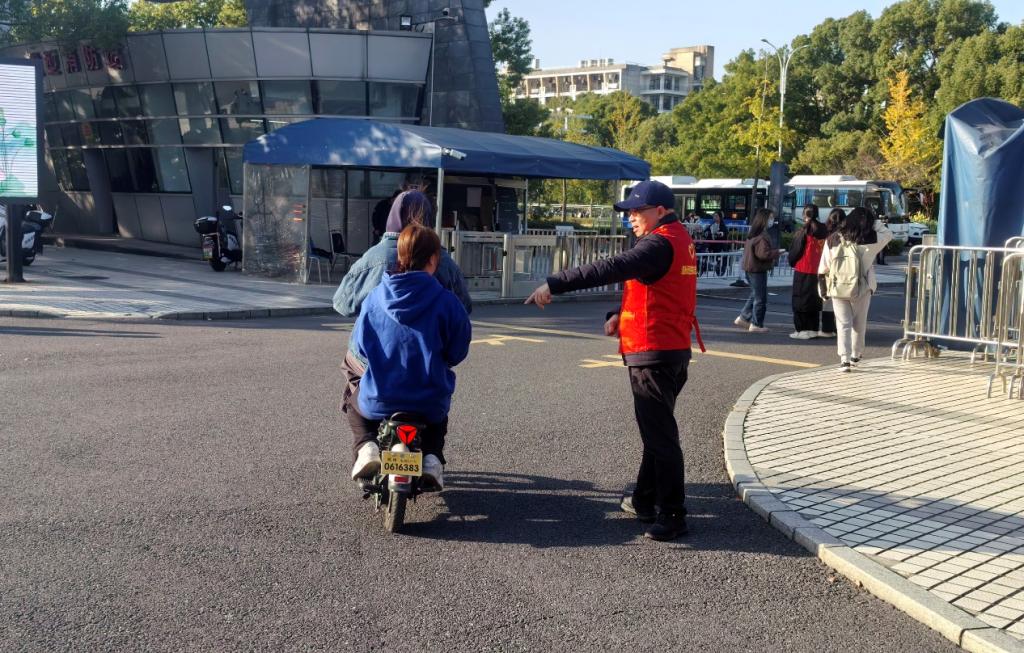 “同学,请停下,骑电瓶车需要佩戴头盔!”“同学,骑车不能看手机!”“同学,骑车不能带人!”“同学,请控制车速”…志愿者们身穿红马甲,引导大家有序文明出行,对电瓶车违规行为及时进行劝阻。