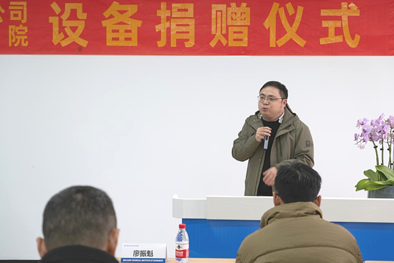 时课公司总经理廖振魁代表捐赠方致辞。他回顾了公司与学院三年多的合作历程,他表示双方持续推进校企合作,成功培养了一批高素质技能人才。他强调此次捐赠不仅是对过去合作成果的肯定,也是对未来更深层次合作的美好期许,希望学校与公司继续在实习就业、技术服务等多个领域实现双赢发展。