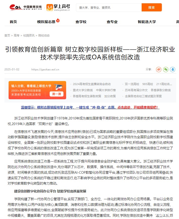 【中国教育在线】引领教育信创新篇章 树立数字校园新样板——华体汇app全站版率先完成OA系统信创改造