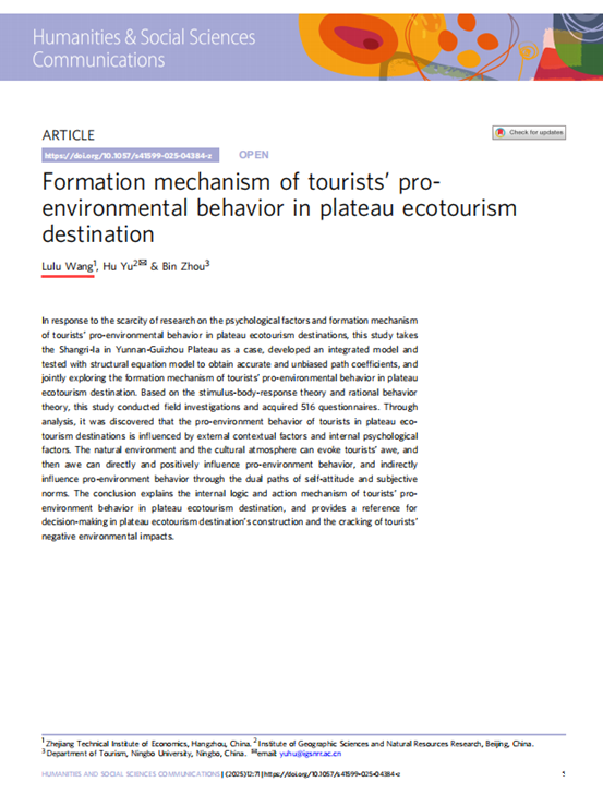 近日,华体汇app全站版工商管理学院王璐璐老师领衔的团队在生态旅游研究领域取得新成果。我校联合中国科学院地理科学与资源研究所、宁波大学在国际知名期刊《Nature》子刊《Humanities and Social Sciences Communications》(JCR分区一区,影响因子3.7)上以长文形式发表题为“Formation mechanism of tourists’ pro-environmental behavior in plateau ecotourism destination”的高水平研究论文,这是我校首次以第一单位在该期刊发表论文。研究得到了浙江省哲学社会科学规划课题和国家自然科学基金项目的支持与资助。