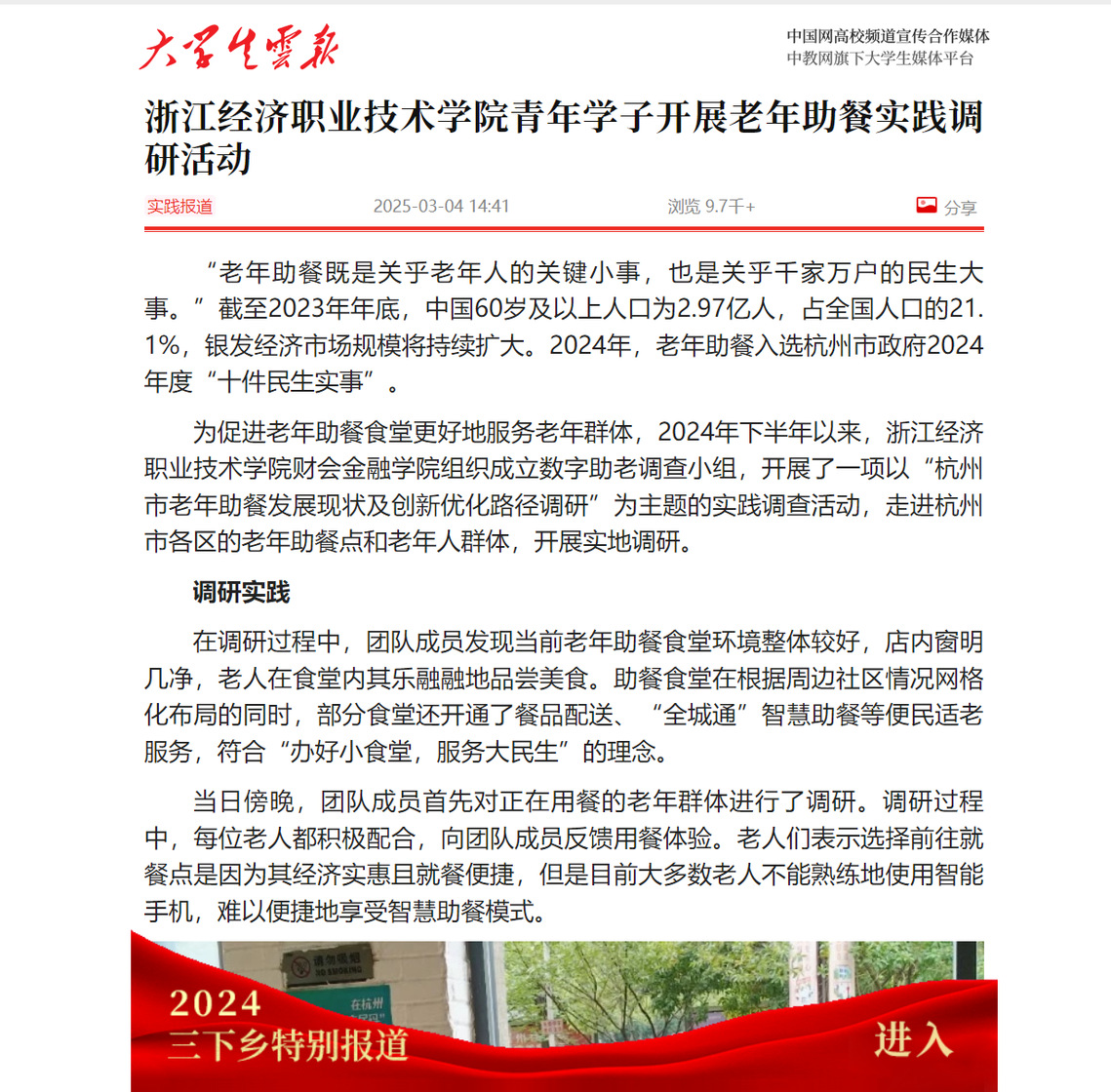 近日,大学生云报报道我校财会金融学院青年学子开展老年助餐实践调研活动。
