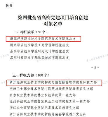 喜报 | 学校新增2个全省高校党建“双创”培育创建对象 近日,中共浙江省委教育工作委员会办公室公布了第四批全省高校党建“双创”培育创建对象名单,我校汽车技术学院党总支、物流与供应链管理学院教师党支部分别入选全省高校党建工作标杆院系和样板支部培育创建对象。2023年,学校建成全省高校党建工作示范校;2024年突破性入选3个全国党建“双创”项目;此次又新增2个全省高校...
