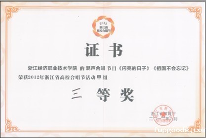 我校参加浙江省高校合唱节活动载誉归来 9月24日至26日,由省教育厅、省文化厅、省财政厅和浙江广电集团共同主办, 杭州师范大学承办的2012年浙江省高校合唱节在杭州师范大学玉皇山音乐学院举行,来自全省47所高校、61支代表队同台竞技,共同唱响永远跟党走的青春誓言。 获奖证书由我校合唱团47名来自各二级学院的学生共同演唱的《闪亮的日...