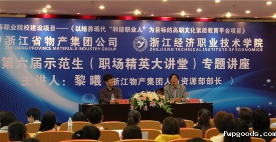 浙江物产集团人力资源部黎曦部长为第六届物产示范生、职场精英修炼营春季班学员开专题讲座 4月21日下午,学校行政楼三楼报告厅气氛热烈,浙江物产集团人力资源部部长黎曦应邀为第六届物产示范生、职场精英修炼营春季班学员作专题讲座,党委副书记、副院长邵庆祥,党委委员、人才培养中心主任、学工部部长姜宇国出席活动,在“物产示范生”教育教学管理办公室、学工部、团委老师的组织下, 100名物产示范生和105名学...
