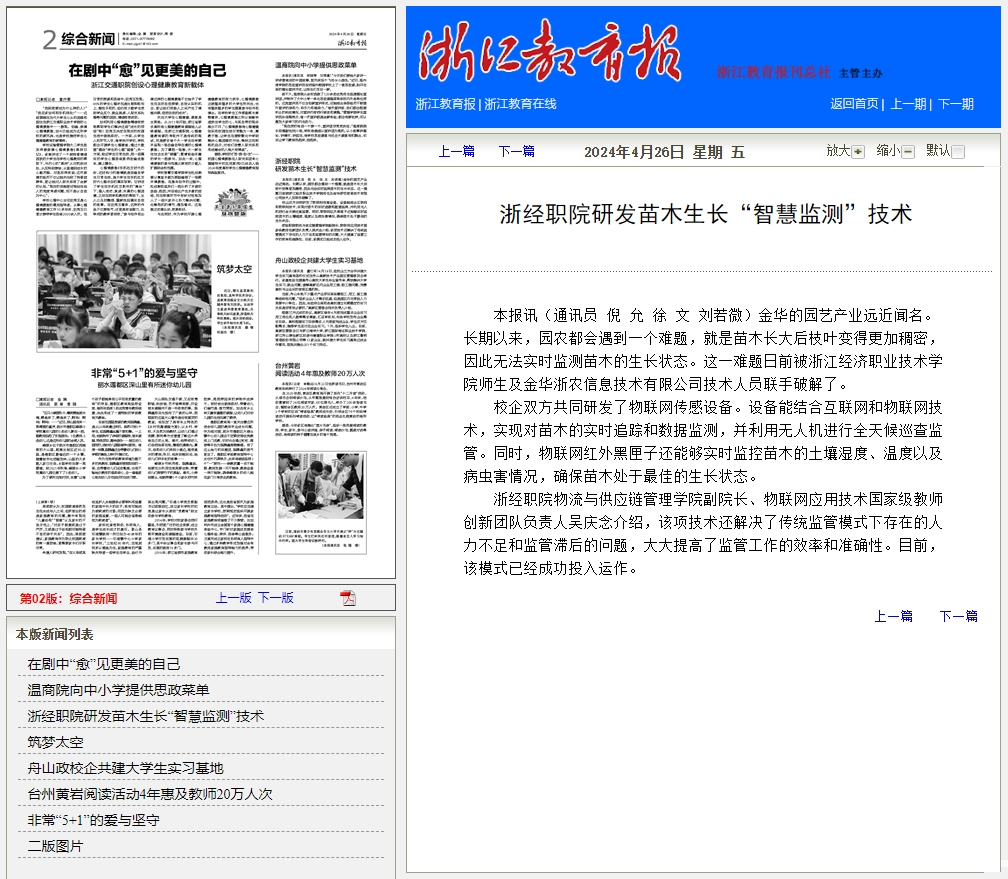 【浙江教育报】【中国网】浙经职院研发苗木生长“智慧监测”技术 近日,《浙江教育报》《中国网》刊登我校师生与企业技术人员联手研发物联网传感设备破解苗木生长技术难题,并成功投入运作。媒体链接:http://www.zjjyb.cn/html/2024-04/26/content_50805.htm媒体链接:http://iot.china.com.cn/content/2024-05/03/content_42777717.html编辑:房栋