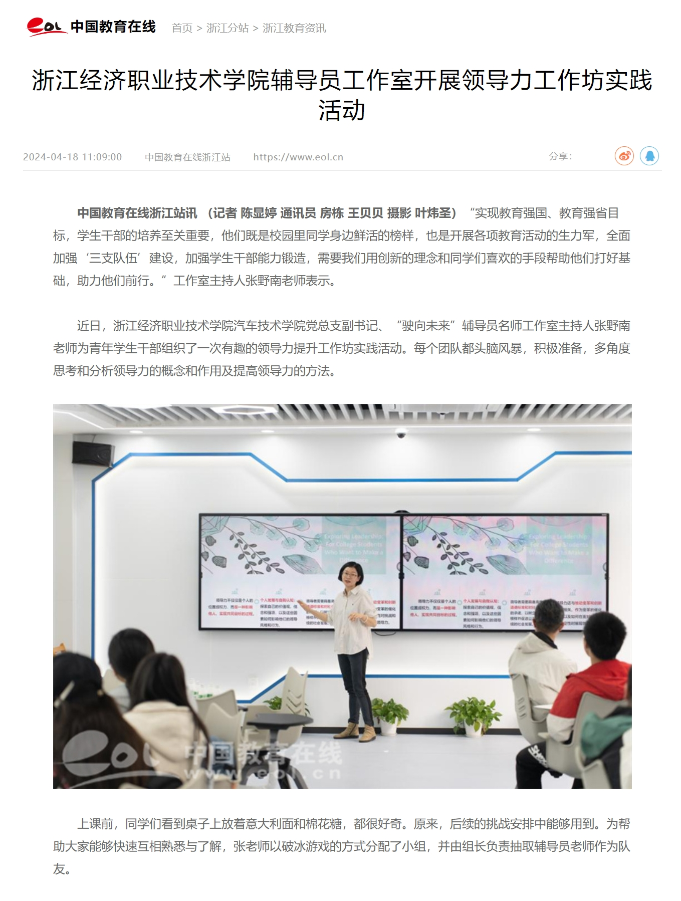 【中国教育在线】华体汇app全站版辅导员工作室开展领导力工作坊实践活动 近日,《中国教育在线》刊登我校强化三支队伍建设,汽车技术学院党总支副书记、“驶向未来”辅导员名师工作室主持人张野南老师为青年学生干部组织了一次有趣的领导力提升工作坊实践活动,加强学生干部能力锻造。媒体链接:https://zhejiang.eol.cn/zhejiang_news/202404/t20240418_2599463.shtml编辑:房栋