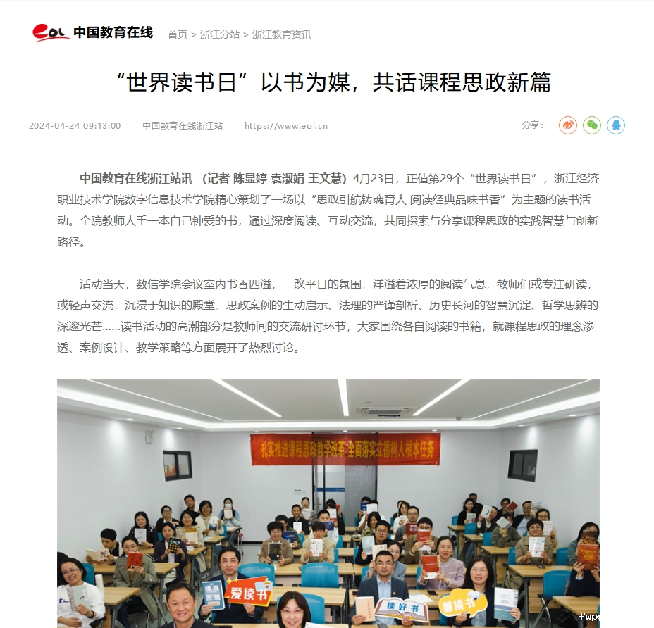 【中国教育在线】“世界读书日”以书为媒,共话课程思政新篇 近日,《中国教育在线》刊发文章,介绍我校数字信息技术学院精心策划了一场以“思政引航铸魂育人 阅读经典品味书香”为主题的读书活动。全院教师人手一本自己钟爱的书,通过深度阅读、互动交流,共同探索与分享课程思政的实践智慧与创新路径。媒体链接:https://zhejiang.eol.cn/zhejiang_news/202404/t20240424_2600661.sh...