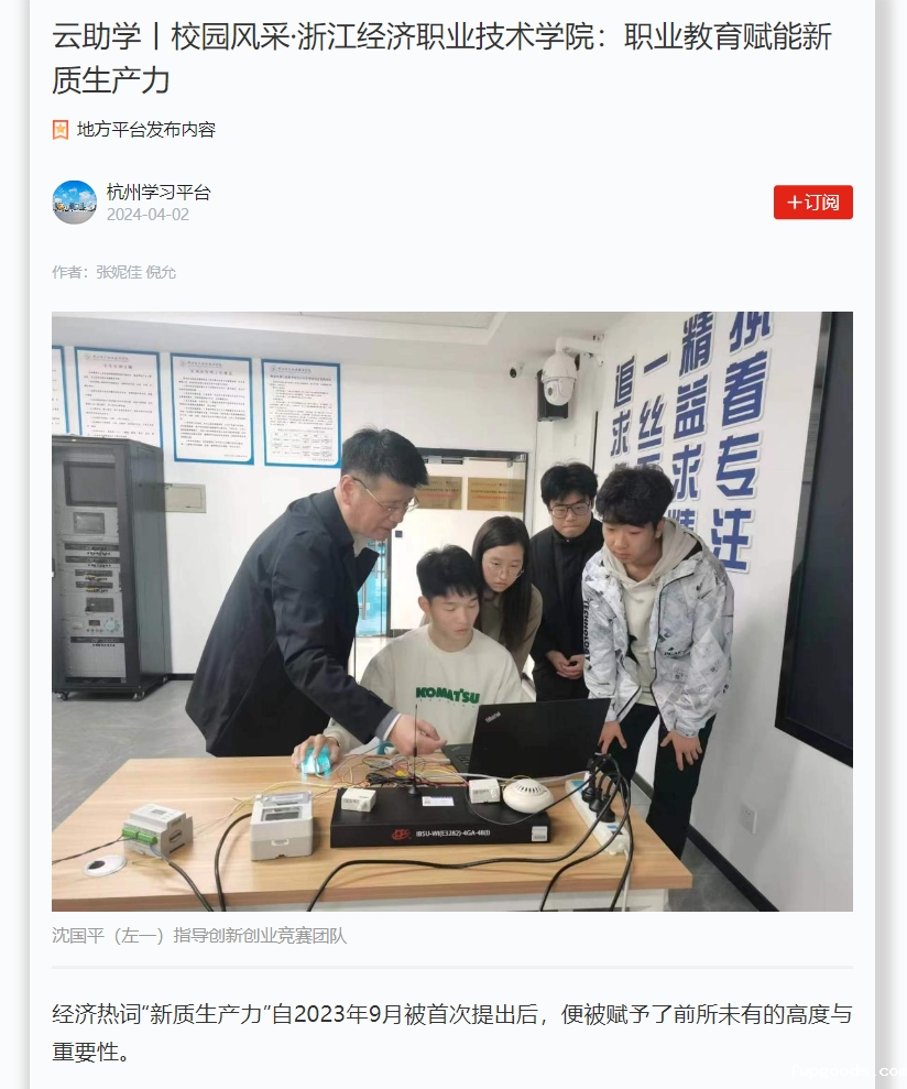 【学习强国】【中国教育在线】育良匠 提新质 促发展 职业教育赋能新质生产力“浙”样做 经济热词“新质生产力”自2023年9月被首次提出后,便被赋予了前所未有的高度与重要性。近日,《中国教育在线》刊登了学校物流与供应链管理学院在探索产教融合过程中,教师沈国平组建劳模和工匠人才创新工作室,指导学生技能竞赛获得多项国家级、省级奖项,获得多项发明和实用新型专利的实践故事,践行为党育人、为国育才”...