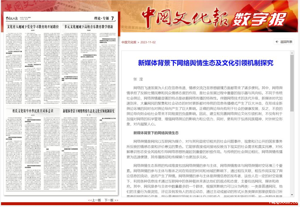 【中国文化报】新媒体背景下网络舆情生态及文化引领机制探究 近日,《中国文化报》刊登我校教师张滢理论文章《新媒体背景下网络舆情生态及文化引领机制探究》。媒体链接:https://npaper.ccmapp.cn/zh-CN/?date=2023-11-02&page=7编辑:房栋