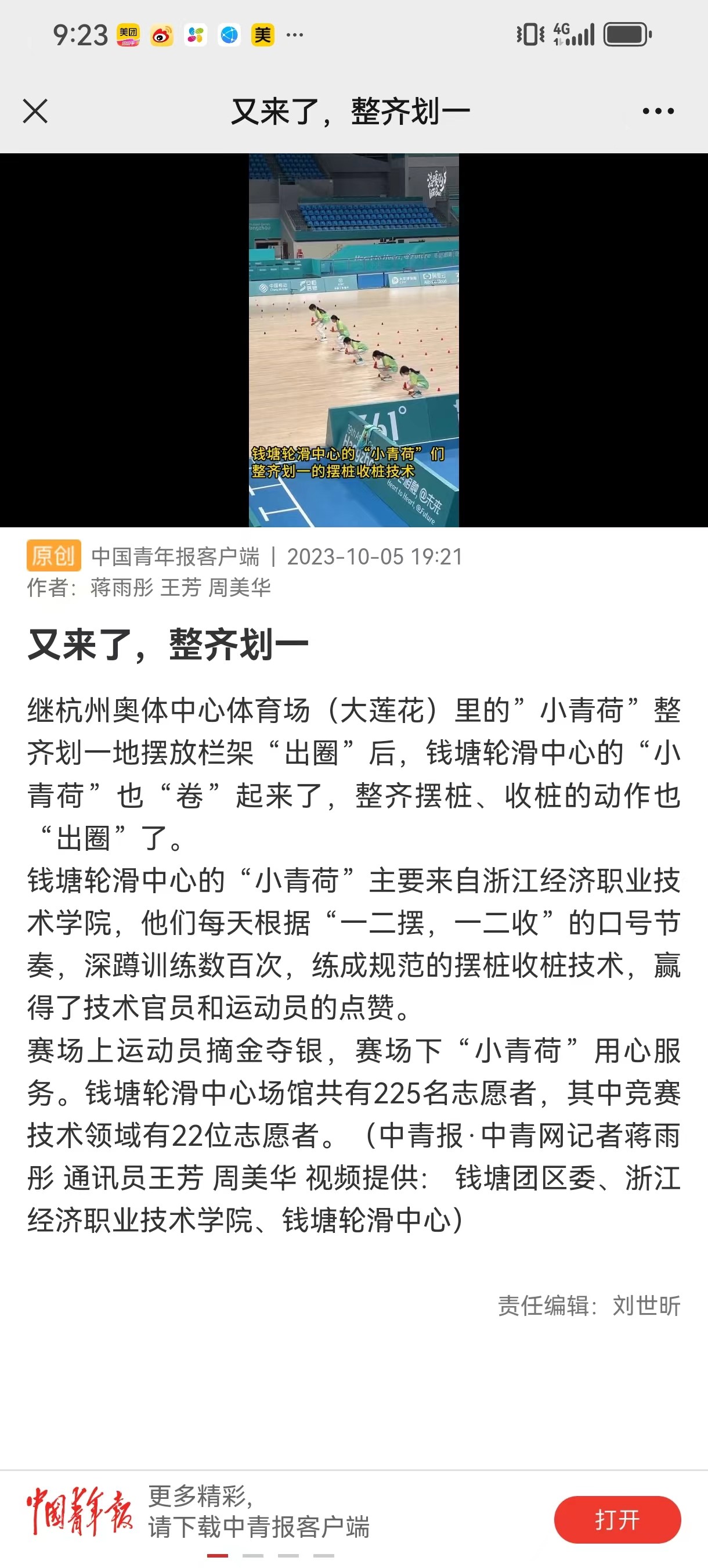 【中国青年报】又来了,整齐划一 近日,《中国青年报》客户端刊登我校钱塘轮滑中心的“小青荷”整齐摆桩、收桩的动作,练成规范的摆桩收桩技术,赢得了技术官员和运动员的点赞。媒体链接:https://s.cyol.com/articles/2023-10/05/content_v6MdngC4.html?gid=28Dga1xp编辑:房栋