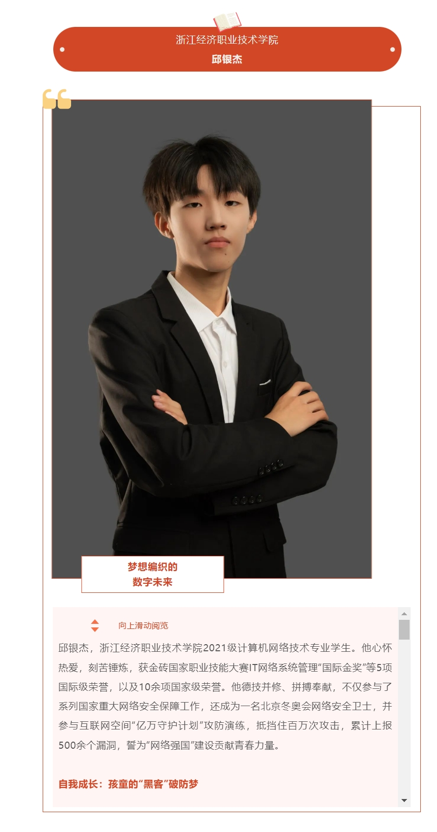 【教育之江】为优秀的他们点赞!一起来听听“浙”些大学生的故事 近日,《教育之江》刊文报道我校数字信息技术学院2021级S602121网络班邱银杰同学斩获浙江省普通高职高专院校国家奖学金特别评审。媒体链接:https://mp.weixin.qq.com/s?__biz=MzAxMDAwMzU1Nw==&mid=2651376835&idx=1&sn=70630a6eb898ed47a0a7448b75c6abc7编辑:房栋