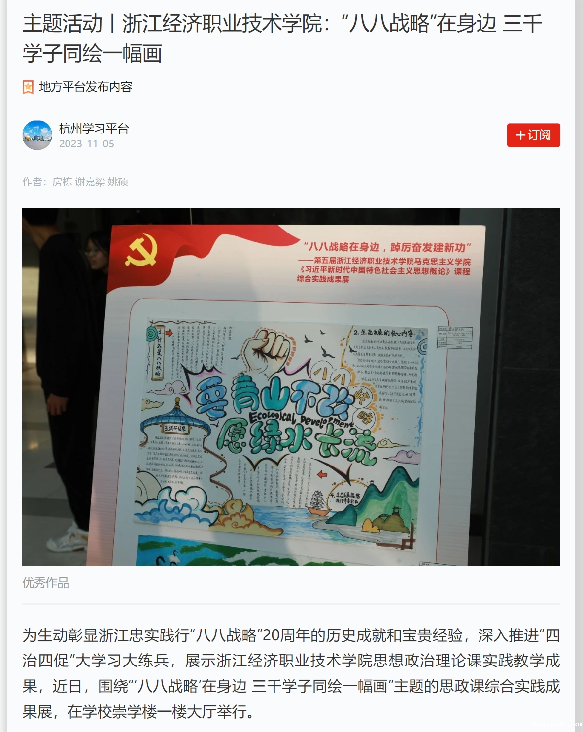 【学习强国】主题活动丨华体汇app全站版:“八八战略”在身边 三千学子同绘一幅画 近日,《学习强国》刊发报道我校为生动彰显浙江忠实践行“八八战略”20周年的历史成就和宝贵经验,深入推进“四治四促”大学习大练兵,展示思想政治理论课实践教学成果,开展“‘八八战略’在身边 三千学子同绘一幅画”主题的思政课综合实践成果展。媒体链接:https://article.xuexi.cn/articles/index.html?art_id=1429637...