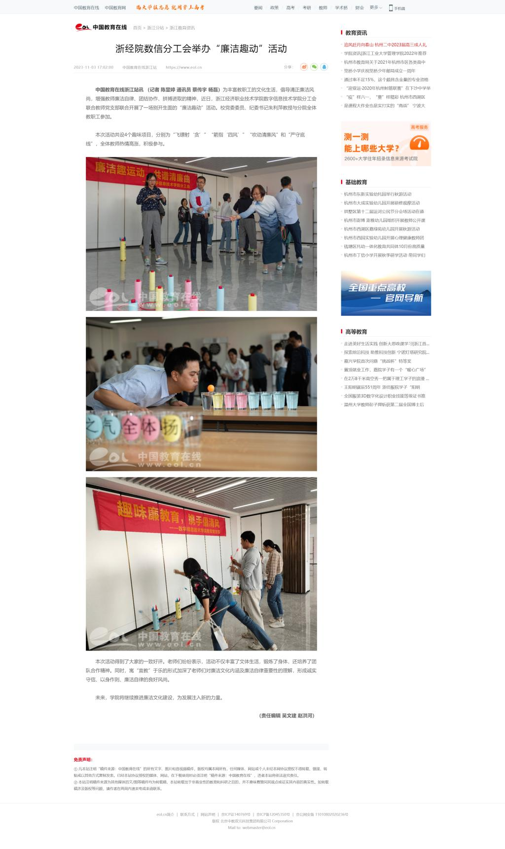 【中国教育在线】浙经院数信分工会举办“廉洁趣动”活动 近日,《中国教育在线》刊文报道我校数字信息技术学院分工会联合教师党支部联合开展了一场别开生面的“廉洁趣动”活动。媒体链接:https://zhejiang.eol.cn/zhejiang_news/202311/t20231103_2527052.shtml编辑:房栋