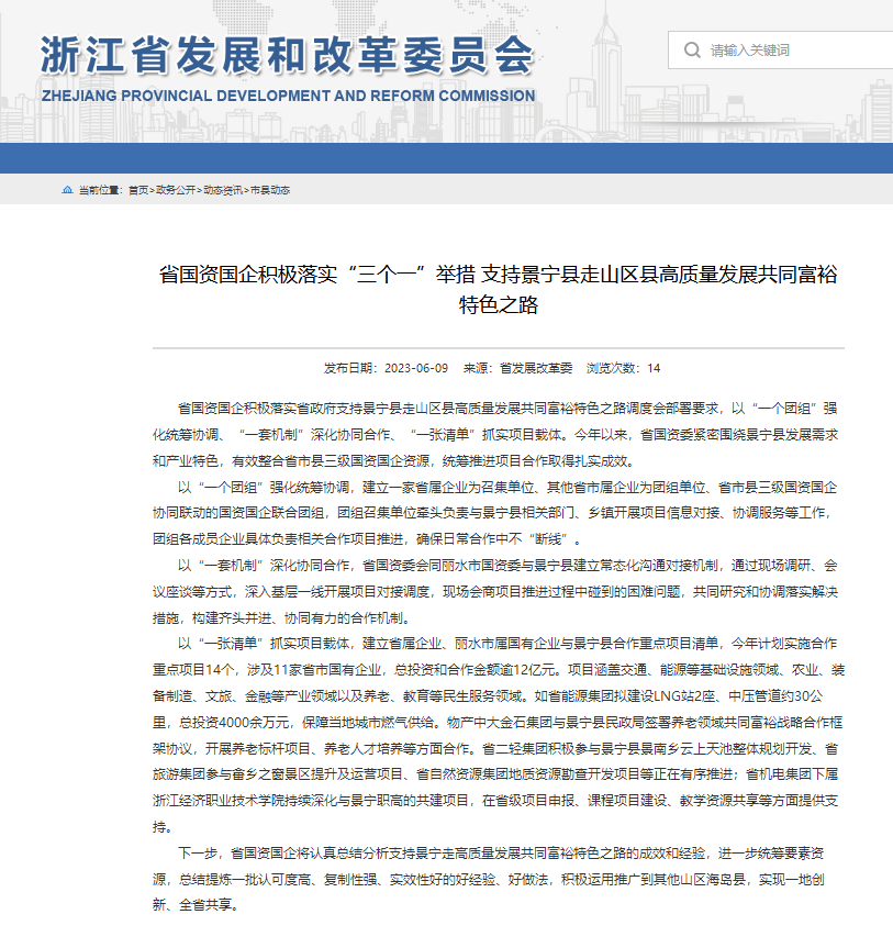 【省发展和改革委员会】省国资国企积极落实“三个一”举措 支持景宁县走山区县高质量发展共同富裕特色之路 近日,《省发展和改革委员会官网》报道我校积极落实“三个一”举措 支持景宁县走山区县高质量发展共同富裕特色之路。 媒体链接:https://fzggw.zj.gov.cn/art/2023/6/9/art_1599546_58936361.html编辑:房栋