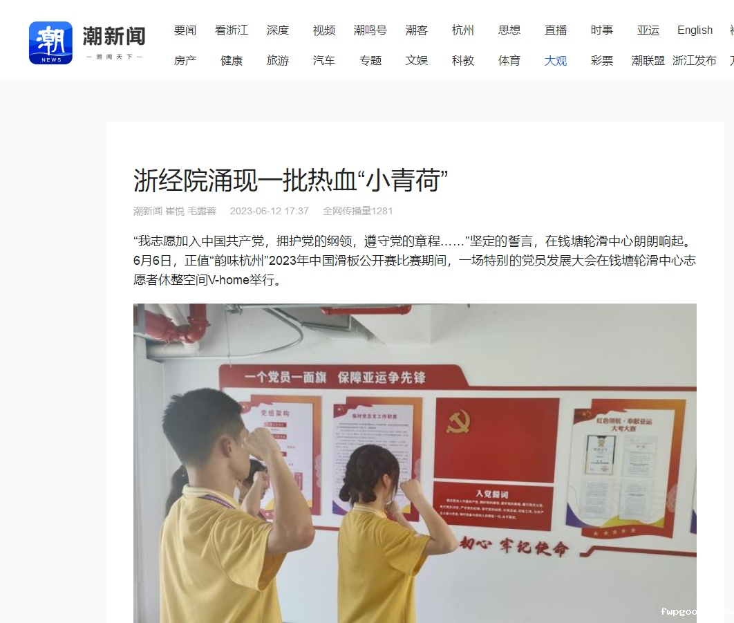 【潮新闻】【学习强国】【中国教育在线】“我志愿加入中国共产党!”誓言在亚运场馆响起 近日,《潮新闻》《学习强国》《中国教育在线》报道我校在“韵味杭州”2023年中国滑板公开赛比赛期间,把党员发展大会开到钱塘轮滑中心,在场馆吸收5名在志愿服务中表现突出的学生为预备党员,为党员队伍增添新鲜血液,让志愿服务之光更加闪耀。潮新闻 媒体链接:https://tianmunews.com/news.html?id=2494806学习强国 &nbs...
