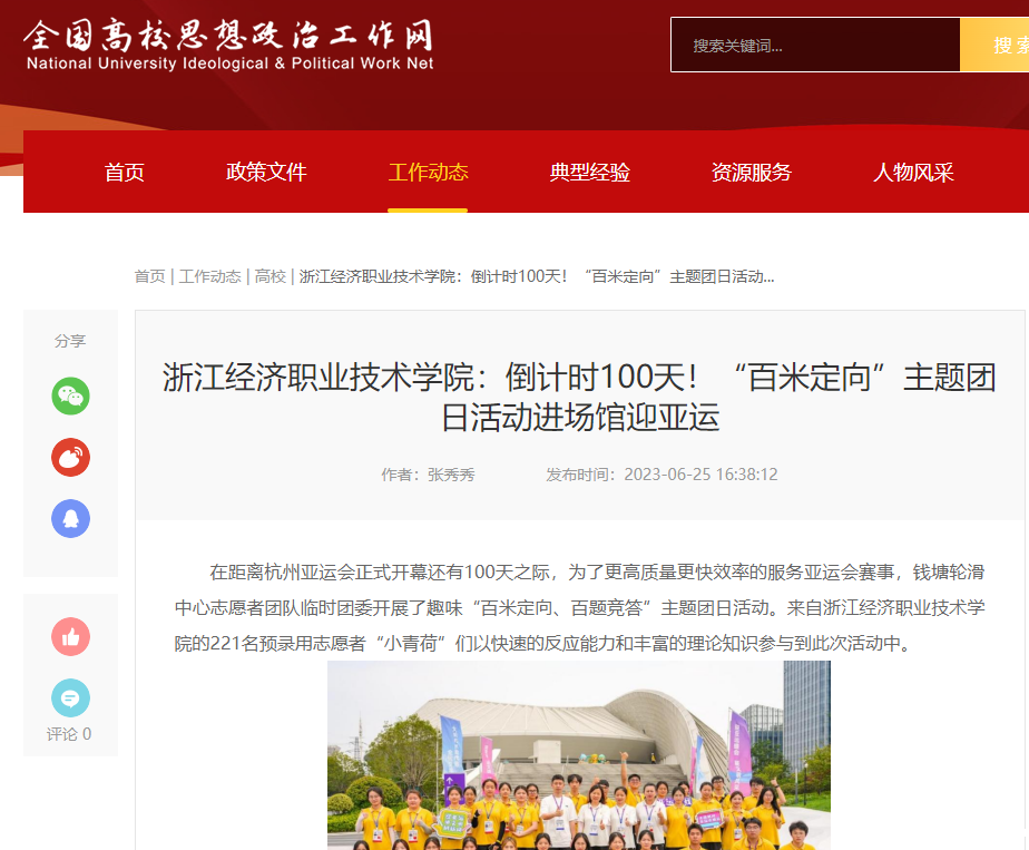 【全国高校思想政治工作网】工作动态·高校·华体汇app全站版:倒计时100天!“百米定向”主题团日活动进场馆迎亚运 近日,全国高校思想政治工作网报道我校亚运志愿者在距离杭州亚运会正式开幕还有100天之际,开展趣味“百米定向、百题竞答”主题团日活动。 媒体链接:https://www.sizhengwang.cn/a/gzdt_zxlb/230625/1544094.shtml编辑:丁林