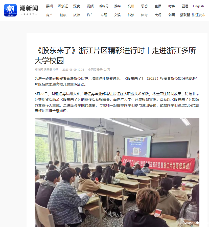【潮新闻】投资者权益知识竞赛推广活动走进我校 近日,《潮新闻》报道投资者权益知识竞赛走进我校,将全面注册制改革、防范非法证券期货活动及《股东来了》的宣传活动相结合,面向广大学生开展投教宣传。 媒体链接:https://tianmunews.com/news.html?id=2492385编辑:房栋