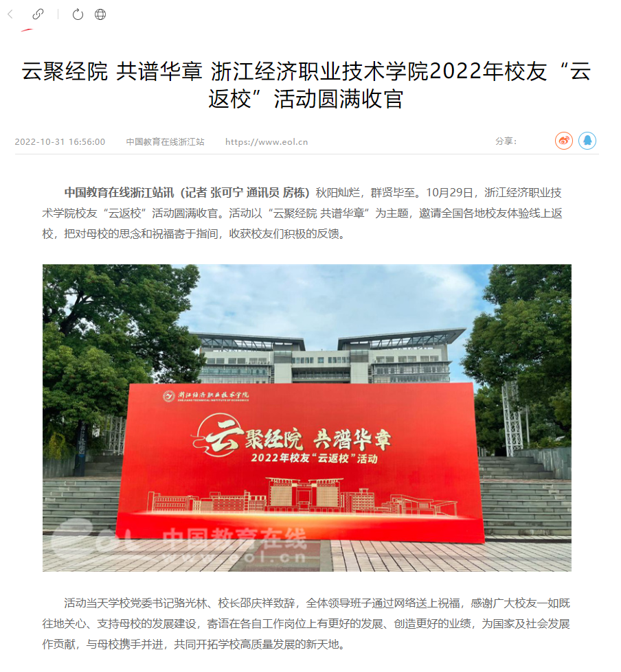 【中国教育在线】云聚经院 共谱华章 华体汇app全站版2022年校友“云返校”活动圆满收官 近日,《中国教育在线》报道我校校友“云返校”活动圆满收官。活动以“云聚经院 共谱华章”为主题,邀请全国各地校友体验线上返校,把对母校的思念和祝福寄于指间,收获校友们积极的反馈。 媒体链接:https://zhejiang.eol.cn/zhejiang_news/202210/t20221031_2253099.shtml编辑:房栋