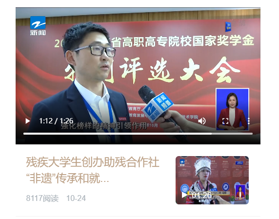【浙江电视台】【学习强国】报道在我校举行的2022年浙江省高职高专院校国家奖学金特别评选大会 10月24日,2022年浙江省高职高专院校国家奖学金特别评选大会在我校举行。来自全省高职高专的15名候选人在评选大会现场进行展示,众多媒体进行了报道。浙江电视台 媒体链接:http://wap.cztv.com/tv/80/1831801.html?play=1学习强国 媒体链接:https://article.xuexi.cn/articles/index.html?art_id=12417410918512542110&am...