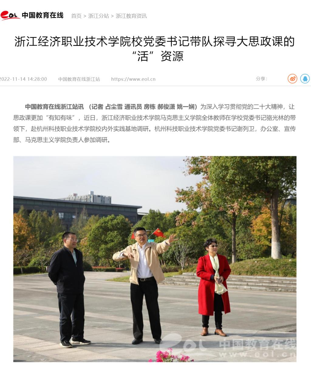 【中国教育在线】我校党委书记带队探寻大思政课的“活”资源 近日,《中国教育在线》报道我校为深入学习贯彻党的二十大精神,让思政课更加“有知有味”,马克思主义学院全体教师在学校党委书记骆光林的带领下,赴杭州科技职业技术学院校内外实践基地调研,主动对接校外各种实践教学基地、搭建实践教学的宽广平台,进一步强化守好红色根脉的担当,探究红色文化资源育人功能及其实践策略...