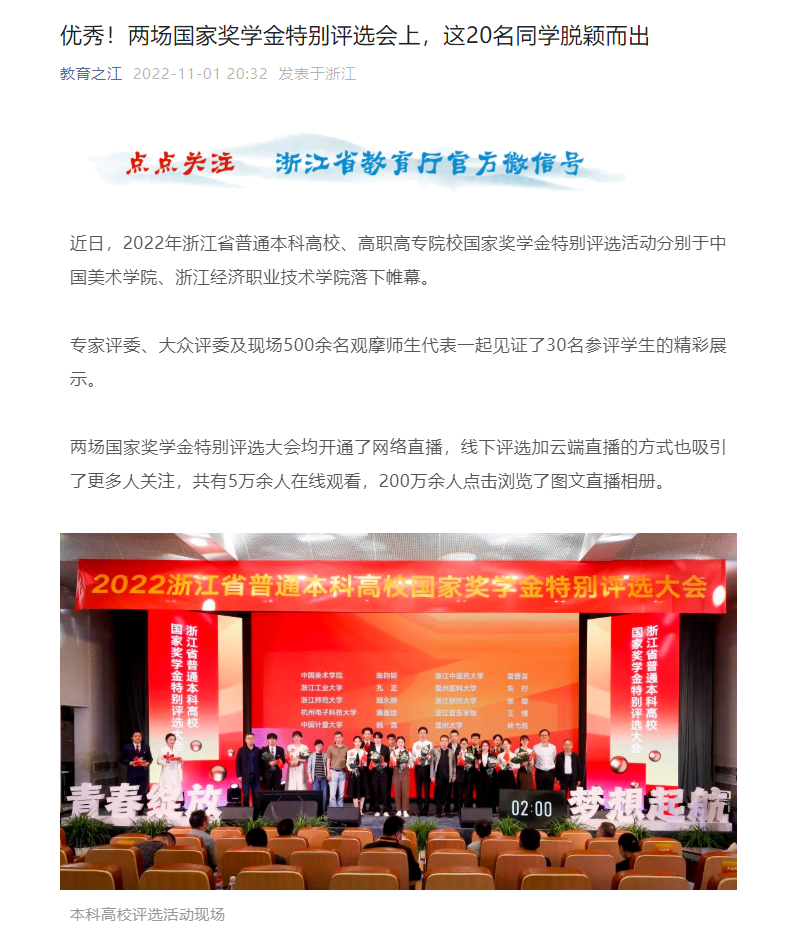 【中国报道】【浙江新闻】【钱江晚报】等6家新闻媒体报道“国家奖学金特别评选相约浙经院” 高职追梦人,经院竞风流2022年浙江省高职高专院校国家奖学金特别评选大会相约浙经院 10月24日,在华体汇app全站版举行的2022年浙江省高职高专院校国家奖学金特别评选大会上,15位优秀大学生依次上台亮相,展示了高职追梦人的骄人风采。我校的李晓楠同学,也展示了经院人的风采。中国报道、中国法治、中国教...