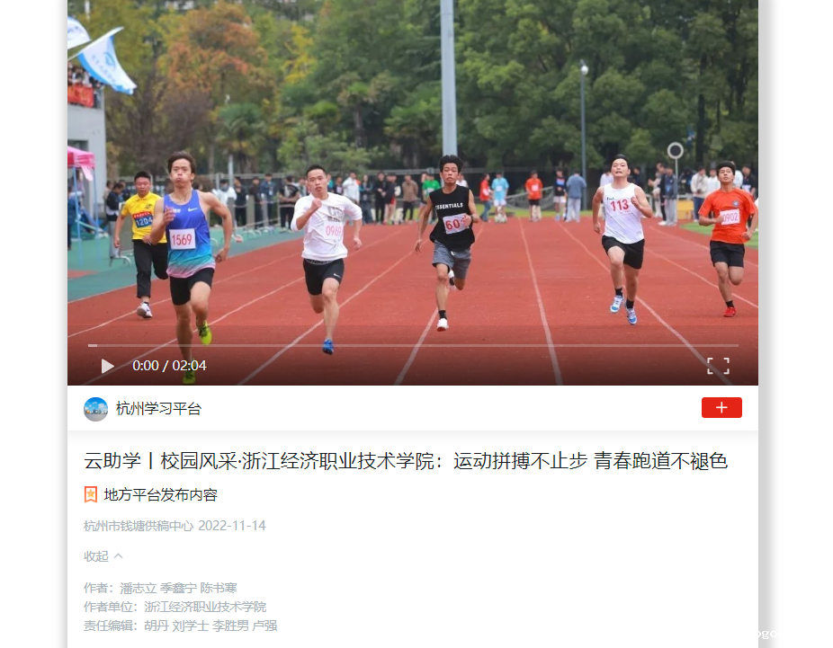 【学习强国】我校运动会纪录学生作品《运动拼搏不止步 青春跑道不褪色》 近日,《学习强国》刊登我校运动会宣传学生作品《运动拼搏不止步 青春跑道不褪色》,展示校运会上奋力拼搏、积极向上的精神风貌。杭州学习平台 媒体链接:https://article.xuexi.cn/articles/index.html?art_id=16046467543396142818&item_id=16046467543396142818&cdn=https%3A%2F%2Fregion-zhejiang-resource&...