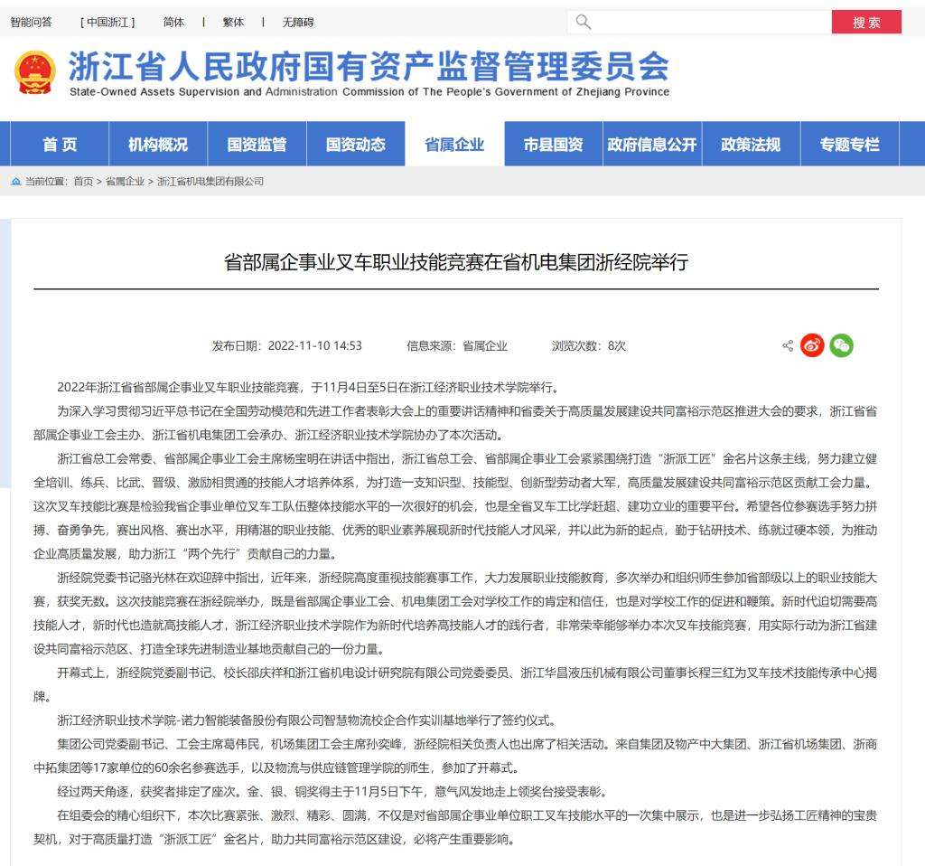 【省国资委网站】省部属企事业叉车职业技能竞赛在省机电集团浙经院举行 近日,2022年浙江省省部属企事业叉车职业技能竞赛在我校举行,在组委会的精心组织下,本次比赛紧张、激烈、精彩、圆满,不仅是对省部属企事业单位职工叉车技能水平的一次集中展示,也是进一步弘扬工匠精神的宝贵契机,对于高质量打造“浙派工匠”金名片,助力共同富裕示范区建设,必将产生重要影响。省国有资产监督管理委员...