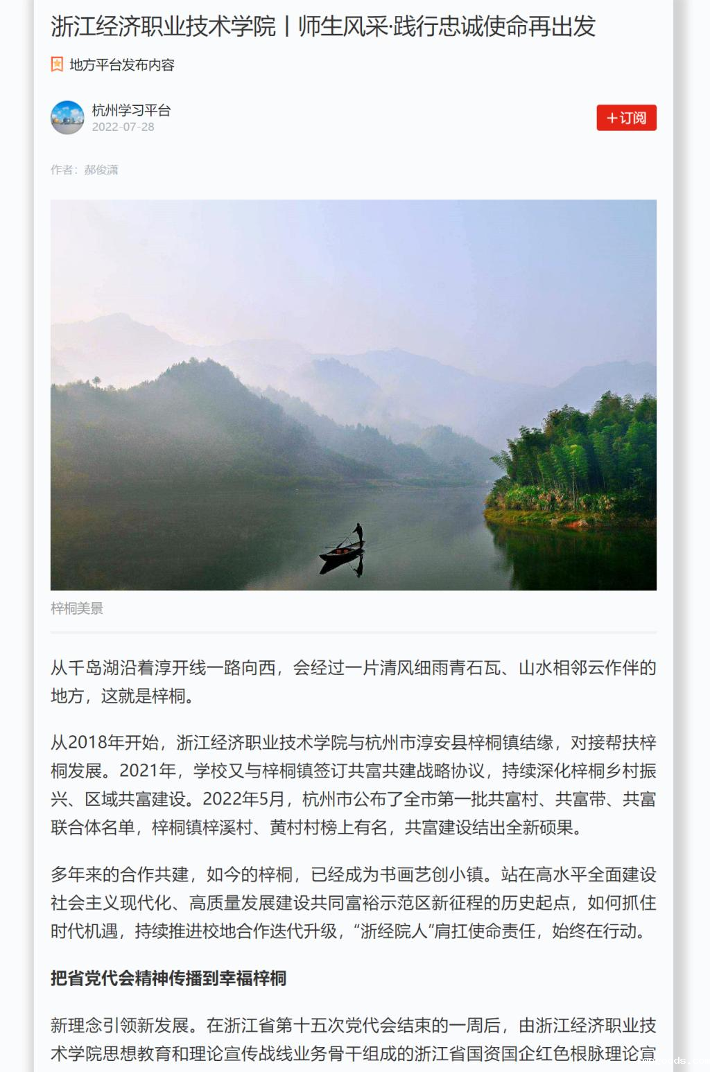 【学习强国】刊登我校师生走进淳安县梓桐镇宣讲践行省第十五次党代会精神 近日,《学习强国》刊登我校师生走进淳安县梓桐镇宣讲践行省第十五次党代会精神,把省党代会精神传播到幸福梓桐,把协调发展的良方带到书画梓桐,把实实在在的资源带给山水梓桐。 媒体链接:https://article.xuexi.cn/articles/index.html?art_id=8199052684119027402&item_id=8199052684119027402&cdn=https%3A%2F...