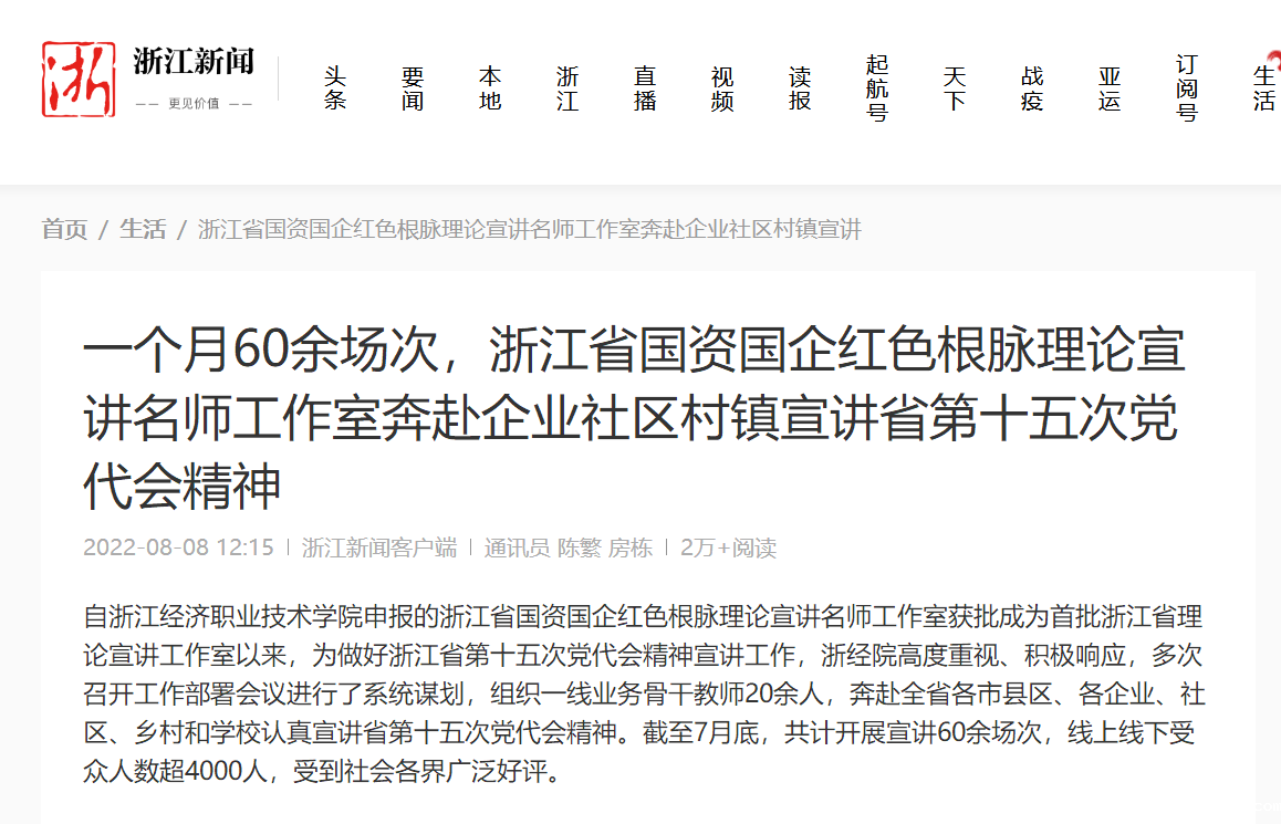 【浙江新闻】报道我校浙江省国资国企红色根脉理论宣讲名师工作室奔赴企业社区村镇宣讲省第十五次党代会精神 近日,《浙江新闻》客户端报道我校为做好浙江省第十五次党代会精神宣讲工作,派出省国资国企红色根脉理论宣讲名师工作室骨干力量,一行20余人奔赴全省各市县区、各企业、社区、乡村和学校认真宣讲省第十五次党代会精神。截至7月底,共计开展宣讲60余场次,线上线下受众人数超4000人,受到社会各界广泛好评。 媒体链接:http...