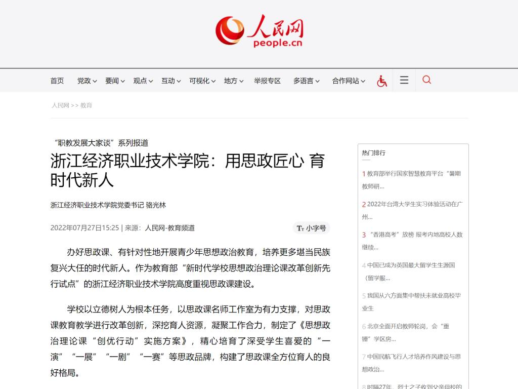 【人民网】刊登我校党委书记骆光林署名文章《用思政匠心 育时代新人》 近日,《人民网》刊登我校党委书记骆光林署名文章《用思政匠心 育时代新人》,介绍学校以立德树人为根本任务,以思政课名师工作室为有力支撑,对思政课教育教学进行改革创新,深挖育人资源,凝聚工作合力,构建了思政课全方位育人的良好格局。 媒体链接:http://edu.people.com.cn/n1/2022/0727/c1006-32487225.html编辑:...