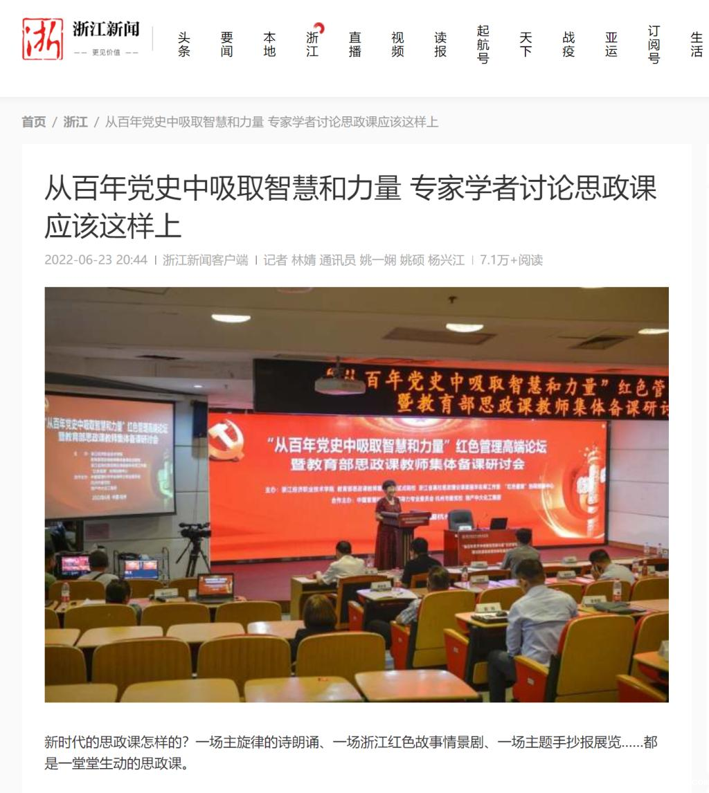 【浙江新闻】【学习强国】报道“从百年党史中吸取智慧和力量”红色管理高端论坛暨教育部思政课教师集体备课研讨会在我校举行 近日,《浙江新闻客户端》《学习强国》报道了我校举行“从百年党史中吸取智慧和力量”红色管理高端论坛暨教育部思政课教师集体备课研讨会。论坛由我校马克思主义学院(教育部思政课教师集体备课试点院校)、浙江省高校思政理论课梁丽华名师工作室、“红色管理”协同创新中心联合主办,“红色管理”协同创新中心全体成员、相...
