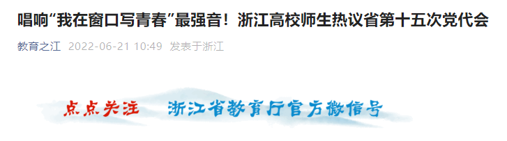 【教育之江】刊登我校党委书记热议省第十五次党代会心得体会 6月20日上午,中国共产党浙江省第十五次代表大会在浙江省人民大会堂开幕,我校师生通过多种方式收看收听大会,掀起热议高潮。我校党委书记热议内容被“教育之江”收录刊登。 媒体链接:https://mp.weixin.qq.com/s/TDl-qcUNJEFf7O-V9_tPwA 编辑:房栋