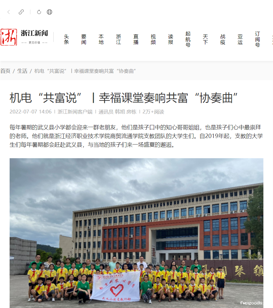 【浙江新闻】再次聚焦我校幸福课堂奏响共富“协奏曲” 近日,《浙江新闻》客户端围绕“两个先行”目标,再次聚焦我校商贸流通学院支每年暑期前往武义县支教团队的大学生们,记录他们三年以来开启幸福课堂奏响共富“协奏曲”。 媒体链接:https://zj.zjol.com.cn/news.html?id=1888900编辑:房栋