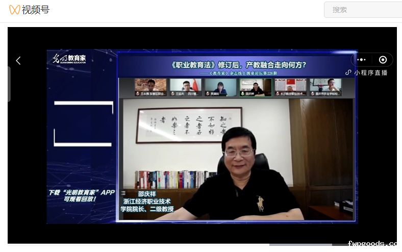 【光明日报】教育家平台邀请我校校长邵庆祥介绍办学成果和特色 近日,校长邵庆祥受邀《光明日报》教育家平台宣传新颁布的《职业教育法》,并作我校办学成果和特色介绍。 编辑:房栋