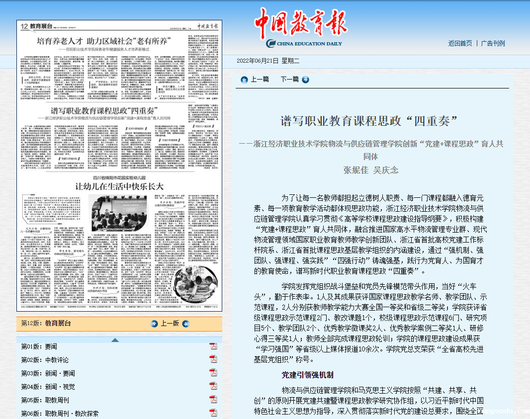 【中国教育报】刊登物流与供应链管理学院创新“党建+课程思政”育人共同体,谱写职业教育课程思政“四重奏” 近日,《中国教育报》刊登我校物流与供应链管理学院积极构建“党建+课程思政”育人共同体,融合推进国家高水平物流管理专业群、现代物流管理领域国家职业教育教师教学创新团队、浙江省首批高校党建工作标杆院系、浙江省首批课程思政基层教学组织的内涵建设,通过“强机制、强团队、强课程、强实践”“四强行动”铸魂强基,...