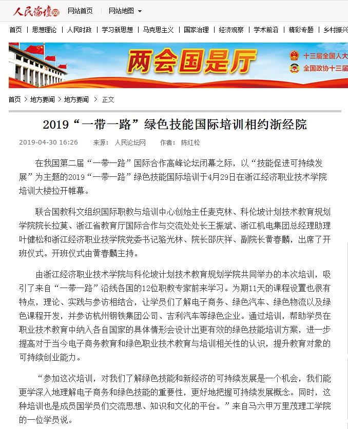 『媒体关注』众多媒体报道我校“服务一带一路 对接产业走出去”职教周活动 在2019职业教育活动周来临之际,参加2019“一带一路”绿色技能国际培训班的12位职教专家,带着进一步契合各国发展的需求,日前走进了绍兴市柯桥区,与当地外向型企业代表共话人才培养。浙江在线、中国教育在线等媒体进行了报道。敬请关注。媒体链接:浙江在线:http://edu.zjol.com.cn/jyjsb/gx/201905/t20190507_10069169....