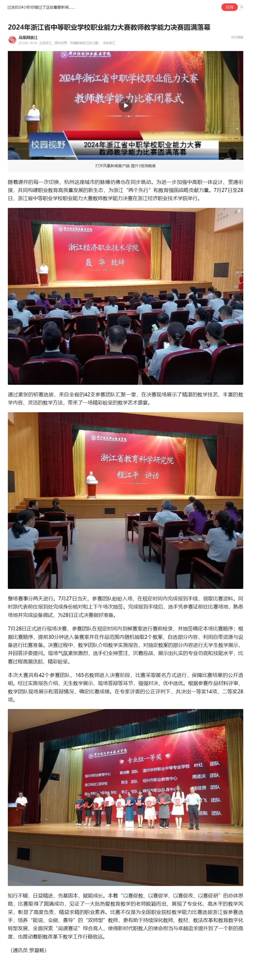 【凤凰网】2024年浙江省中等职业学校职业能力大赛教师教学能力决赛圆满落幕 近日,《凤凰网》报道了2024年浙江省中等职业学校职业能力大赛教师教学能力决赛经过精心筹备和激烈角逐,圆满完成了3个组别的所有赛事,正式在我校落下帷幕。来自全省的42支参赛团队汇聚一堂,展示了精湛的教学技艺、丰富的教学内容、灵活的教学方法,带来了一场精彩纷呈的教学艺术盛宴。这是也是自2020年以来,我校第五次...